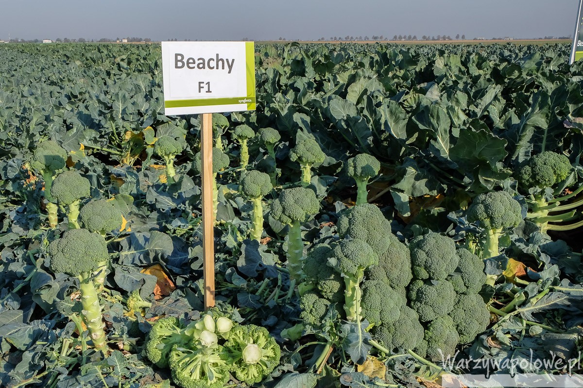 Plantacja na której odbywało się spotkanie zakładana była na początku lipca, w poplonie po uprawei brokułów na zbiór czerwcowy. Rozsadę dostarczyła tu Grupa Producentów Rozsad Krasoń, która była partnerem tego spotkania. Plantacja ta jest przykładem dobrego planowania kampanii zbioru brokułów. W zasadzie nic tu nie działo się przypadkowo – podkreślał Marek Zieliński, gospodarz spotkania z ramienia firmy Syngenta. Jak podkreślał Paweł Kwiatkowski z firmy Orelmens takie działania są bardzo potrzebne, do tego by producent mógł w optymalnym terminie zebrać wszystkie róże i do zakładu dostarczyć jak najlepszej jakości produkt w postaci różyczki. Na tej plantacji najwcześniej bo 6-7 lipca wysadzana był odmiana Monrello F1 o nieco dłuższym okresie wegetacji, a nieco później bo koło 15 lipca pozostałe odmiany czyli Batory F1, Beachy F1, Beany F1, Monaco F1 i odporna na kiłę kapusty odmiana Monclano F1. Podczas prezentacji odmian specjaliści z Syngenta szczególną uwagę zwrócili na odmianę Beachy F1, która to ma wzbogacić i tak już szeroką gamę odmian brokułów Syngenta. Odmian ta tworzy niezbyt duże róże, ale za to bardzo ciężkie i zbite. Polecana jest do uprawy w większym zagęszczeniu – nawet 38-40 tys. szt./ha. Jest to odmian o stosunkowo krótkim okresie wegetacji 70-75 dni, polecana do uprawy na zbiór wiosenny, oraz na początek jesiennej kampanii jesiennej i zbiory od początku września. Odmiana ta cechuje się bardzo kształtną różą, brakiem jamistością głąba, jak również bardzo dobrą przydatnością do różyczkowania z przeznaczeniem do przemysłu.