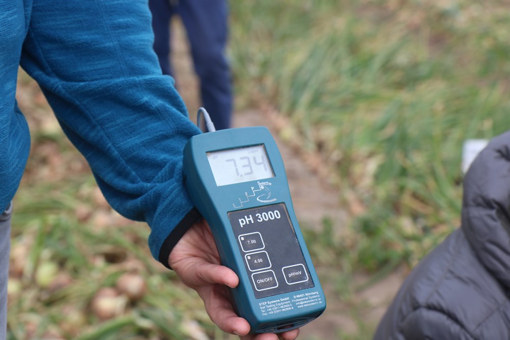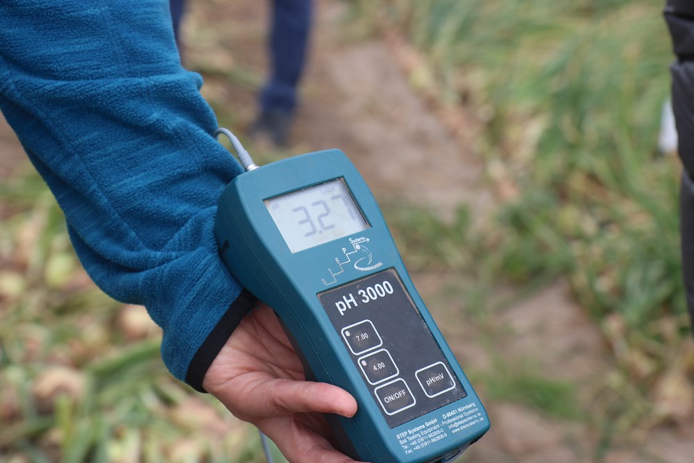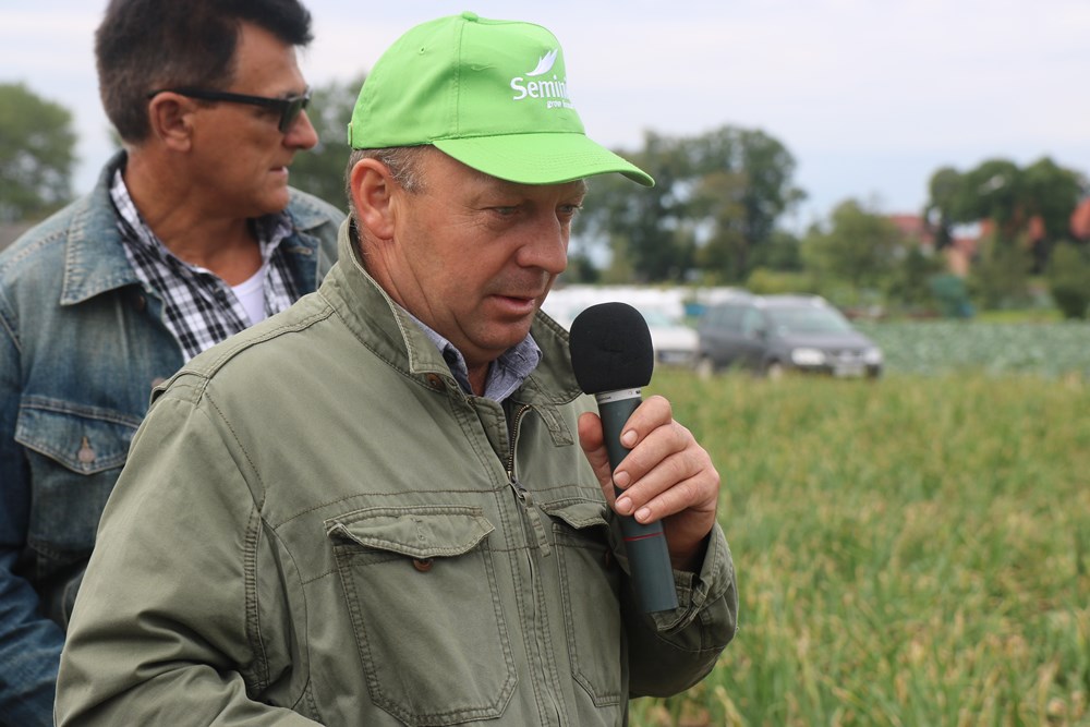 Fertygacja w uprawie cebuli nie tylko poprawia plonowanie, ale także nie sprzyja presji chorób grzybowych w takim stopniu jak deszczowanie. Zasady żywienia roślin omówił Ożarek Grzegorz z firmy ICL. Zalecenia nawozowe każdorazowo przygotowywane są indywidualnie. Abyśmy mogli zacząć współpracę należy wykonać badanie wody, aby ustalić jej odczyn pH i zawartość składników odżywczych. Niewątpliwą zaletą fertygacji jest wyższa przyswajalność elementów podawanych taśmami kroplującymi niż pogłównie – mówił reprezentant ICL. W przypadku plantacji Wojciecha Wiecheckiego stosowano nawóz Solinure 10-5-40 dozowany 3 krotnie w ciągu tygodnia, a jako uzupełnienie dolistnie podawano produkty z gamy Agroleaf. Nie zdecydowano się na wprowadzenie do żywienia preparatów, które w swym składzie zawierają wapń, gdyż w pierwiastek ten bogata jest woda wykorzystywana do podlewania plantacji. Zalecenia nawozowe były także dostosowywana do warunków pogodowych. Ze względu na obfite opady deszczu część składników została przepłukana w warstwy gleby niedostępne dla cebuli. Do czyszczenia linii kroplujących i obniżania odczynu pH pożywki czy cieczy roboczej w opryskiwaczu godnym polecenia produktem jest PeKacid. 1% stężenie tego nawozu ma odczyn pH na poziomie 2,2.