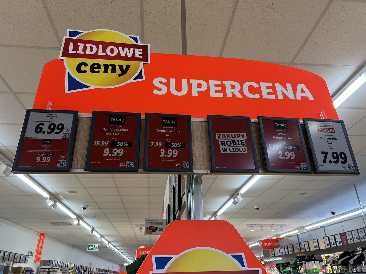 Większe zróżnicowanie cenowe obowiązuje obecnie w supermarketach. Te prześcigają się w różnorodności oferty, nie brakuje również promocyjnych cen. W najpopularniejszych sieciach handlowych znajdziemy zarówno dynie w typie Halloween, hokkaido, piżmowe, jak również dynie ozdobne. Dla leniwych, lub cierpiących na brak czasu znajdą się również dynie już pomalowane z myślą o Halloween. W sieci Biedronka znajdziemy mix dyń kulinarnych w cenie 6,99 zł/kg. W Auchan oferta jest bardziej rozbudowana i zależna od odmiany – dynie w typie halloween kupimy już za 95 gr/kg, podczas gdy dynie piżmowe to już koszt 11,99 zł/kg. W Lidlu najtańsze dynie to koszt 99 gr/kg, podczas gdy te w typie hokkaido kosztują 2,99 zł/kg (cena promocyjna), a za ozdobne zapłacimy 3,99 zł/kg (niemalowana) lub 9,99 zł/kg (malowana). Podobne oferty promocyjne znajdziemy także w pozostałych sieciach handlowych.