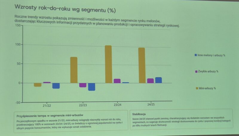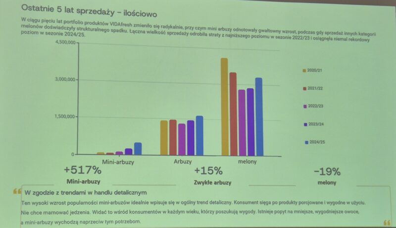Największą dynamikę wzrostu notuje segment arbuzów mini, które sprzedawane są na sztuki i odpowiadają trendom konsumenckim: są wygodne, łatwe w spożyciu i nie psują się szybko. Po początkowym spadku sprzedaży na przestrzeni sezonu 2021/22, mini arbuzy w kolejnych latach zanotowały wzrosty na poziomie 100% rok do roku, co świadczy o znaczeniu tej kategorii w całym segmencie arbuzów. Sezon 2024/25 charakteryzował stabilnością w sprzedaży i we wszystkich asortymentach (arbuzy tradycyjne, arbuzy mini i melony odnotowane znaczące wzrosty sprzedaży.