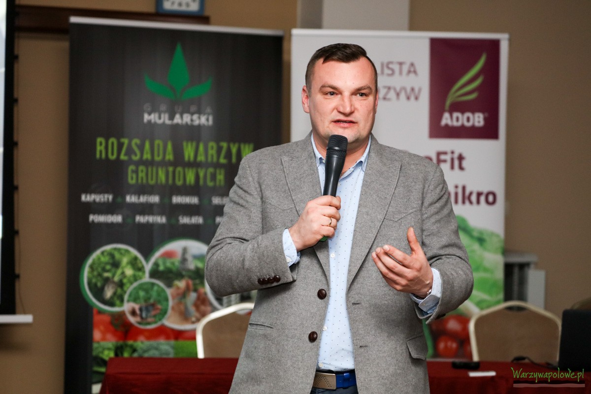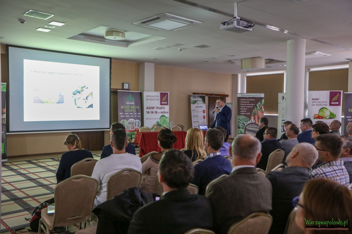 Włodzimierz Prus omawiając ofertę firmy ADOB, podkreślał unikalna formę nawozów dolistnych oferowanych w formie chelatów. W gronie tych produktów dość unikalnym jest chelat wapnia CA IDHA – będący bardzo szybko działającą forma wapnia, pozwalającą zapobiegać niedoborom tego pierwiastka w wielu uprawach. Stosowanie nawozów w formie chelatów zapewnia bardzo szybkie pobieranie składników pokarmowych, bez ryzyka oparzeń na roślinach oraz daje możliwość stosowania niskich ale efektywnych dawek nawozów – podkreślał W. Prus. Poszczególne gatunki warzyw mają specyficzne wymagania co do niektórych mikroelementów, np. kapusta i kalafior szybko reaguje na niedobór manganu (chlorozy liści – tkanek miedzy nerwami) czy boru (jamistość głąba, zhamowanie wzrostu, sztywne liście). U brokułu, niedobór molibdenu przyczynia się do zanikania stożka wzrostu. Prelegent odniósł się też do powszechnego problemu wielu producentów kapustnych jakim jest kiła. Choroba związana jest z brakiem zmianowania w uprawie warzyw i niskim pH. Występowaniu choroby sprzyja stosowanie N-NH4, która sprzyja zakwaszaniu gleby. Podwyższenie pH do 7, ogranicza porażanie roślin przez kiłę, ale źródło choroby jest w cały czas obecne w glebie.