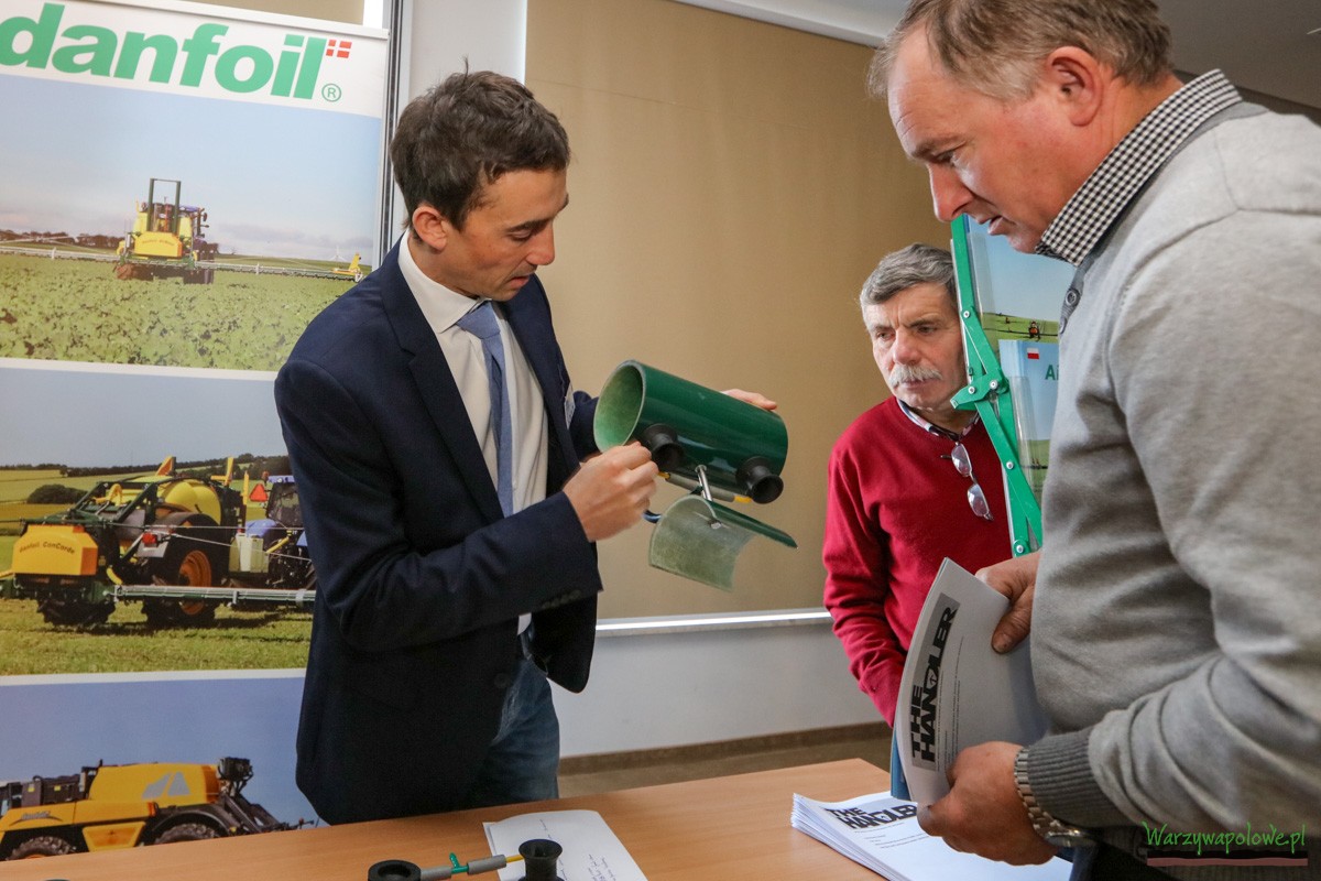 Adrian Kubiak przedstawił ofertę firmy Danfoil, duńskiego producenta specjalistycznych opryskiwaczy. Unikalną ich cechą jest małe zużycie wody 30-80 l/ha. Efekt taki można uzyskać dzięki temu że ciecz jest rozprowadzana z użyciem bardzo dużej ilości powietrza. Te opryskiwacze nie działają bez powietrza, a efektem jest bardzo wysoka skuteczność zabiegów i doskonałe pokrycie roślin cieczą, nawet spodniej stronie liści – podkreślał A. Kubiak.
