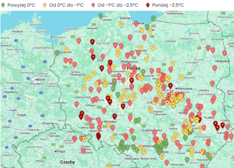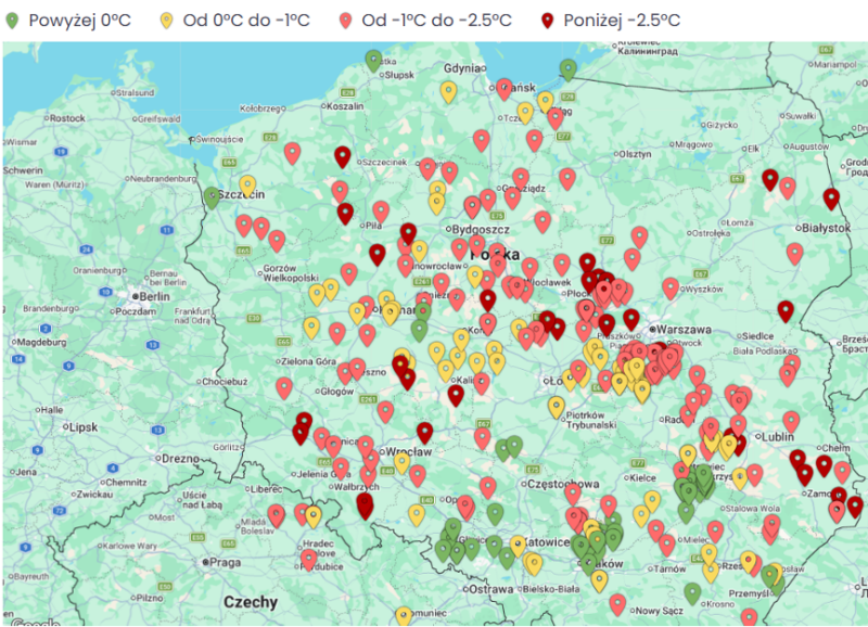 Brak przymrozków (>0°C – zielone punkty):