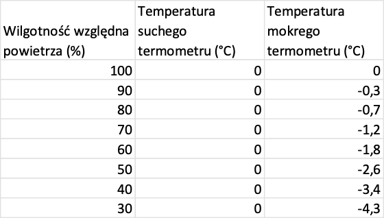 W materiale również jak samemu stwierdzić jaka mogła być temperatura mokrego termometru na bazie suchego termometru oraz wilgotności powietrza.