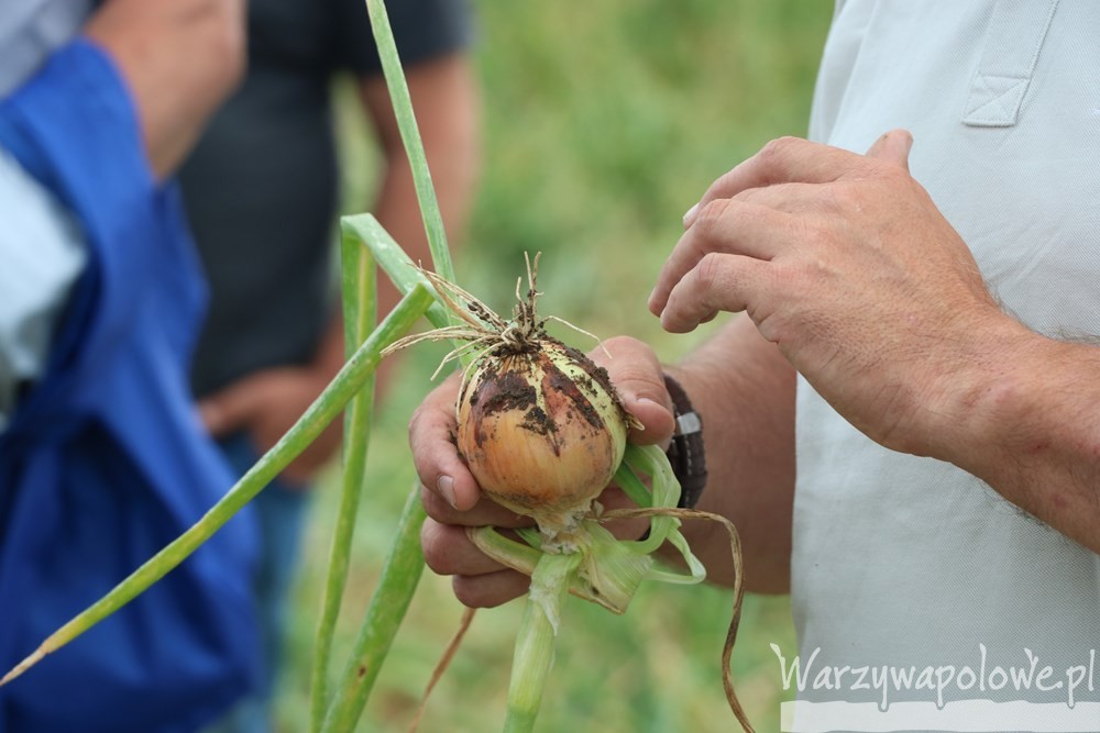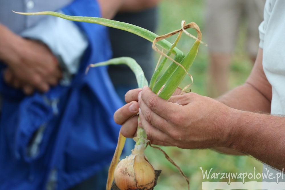 Generalny stan plantacji Wojciecha Wiecheckiego w dniu 10 sierpnia był dobry. Nawożenie i ochrona cebuli to czynniki, których efektywność w pełni ocenić można dopiero po zbiorach. Póki co, można jedynie stwierdzić, że te zapowiadają się bardzo obiecująco. Z problemów, które uwidoczniły się na plantacji na pierwszy plan wysuwa się żerowanie wciornastków. Czynnikiem sprzyjającym rozwojowi ich populacji jest stosowanie nawadniania kropelkowego. Tam, gdzie korzysta się z deszczowni istnieje możliwość wypłukania przynajmniej części szkodników z roślin. Pewnym wyzwaniem, nie tylko na tej plantacji, w 2018 roku okazało się stemphylium. Choroba ta atakowała plantację, jednak dzięki umiejętnie skomponowanej strategii udało się utrzymać ją w ryzach i nie wydaje się, by przyczyniła się do powstania znacznych szkód. Tylko na niektórych roślinach zaobserwowano objawy alternariozy. Ma ona charakter następczy i poraża te rośliny, które już wcześniej borykały się z innymi zagrożeniami. Reasumując, wygląda więc na to, że nawożenie i ochrona cebuli prowadzone były właściwie. Jeśli stawki za plon okażą się przyzwoite, to zwiedzana w Liszkowie kwatera pozwoli zarobić.