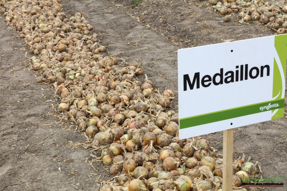 Rijnsburger 5 Holenderka to typowa odmiana z grupy rijsnsburgrt oferująca dobra jakość zgrubień i możliwość ich przechowywania. To co wyróżnia tę odmianę to silny wigor roślin co przekłada się na szybkie i wyrównane wschody, jak również wyrównany wzrost roślin w dalszym okresie uprawy. Widoczne to był także w tym sezonie, gdzie odmiana ta dłużej utrzymywała dobra kondycję szczypioru w porównaniu do innych. Medaillon F1 to odmiana wyróżniająca się mocnym system korzeniowym, dzięki któremu radzi sobie nawet na słabszych glebach i w warunkach deficytu wody. Łuska u tej odmiany jest nieco ciemniejsza, ale dzięki dobremu wyrównaniu cebul, stanowi ona doskonały surowiec do pakowania w worki. Na poletkach pokazowych znalazły się też dwie nowe odmiany, będą co prawda jeszcze w testach a cechujące się dobrym wyrównaniem i mocną łuską. Pokazują one, że hodowla kolejnych odmian jest realizowana w Syngenta i już niebawem zaprocentuje kolejnymi nowościami.