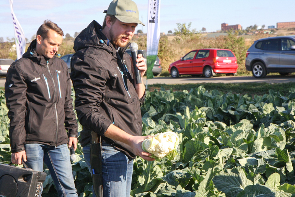 Marek Zieliński omówił odmiany uprawiane w tej lokalizacji. Wśród kalafiorów uczestnicy mogli przyjrzeć się odmianie Gohan F1 cechującej się dość silnym wzrostem i dobrą jakością róży. Po sąsiedzku w kwaterach zobaczyć można było dwie siostrzane odmiany Cabral F1 oraz David F1. Cabral F1 to odmiana, która z trzech wymienionych powyżej charakteryzuje się nieco krótszym okresem wegetacji, którzy zawiera się w przedziale 80-85 dni. David F1 i Gohan F1 na osiągnięcie gotowości do zbioru potrzebują średnio o 5 dni więcej. Zaletą Davida jest jednak powtarzalne, dość obfite plonowanie. Odmiany te uprawiane są głównie z przeznaczeniem przemysłowym. Na świeży rynek z dostępnych na plantacji w Brukach Unisławskich odmian wyróżnić można odmianę Clapton F1 o okresie wegetacji 80-85 dni, cechującą się doskonałym okryciem róży oraz odpornością na kiłę kapusty. Warta wymienienia jest także odmiana Claforsa F1, która gotowość do zbioru osiąga nieznacznie szybciej i jest bardziej uniwersalna. Może być bowiem wysadzana w słabszych kwaterach ze względu na silny system korzeniowy, można ją sadzić zarówno wiosną jak i w uprawie poplonowej. Clarina F1 to nowość w ofercie Syngenty. Przypomina w swej charakterystyce nieco Claptona, choć ma nieco krótszy okres wegetacji. Dwie kolejne odmiany, stworzone z myślą o świeżym rynku, to Aerospace F1 oraz Vespucci F1. Tym, co wyróżnia pierwszą odmianę jest silny wzrost. Druga zaś, dzięki jakości róży, znajduje nabywców wśród wymagających klientów, takich jak choćby sieci supermarketów. Równie dobrą jakość oferuje odmiana Korlanu F1, choć może ona także znaleźć swe zastosowanie w uprawach na potrzeby zakładów przetwórczych.