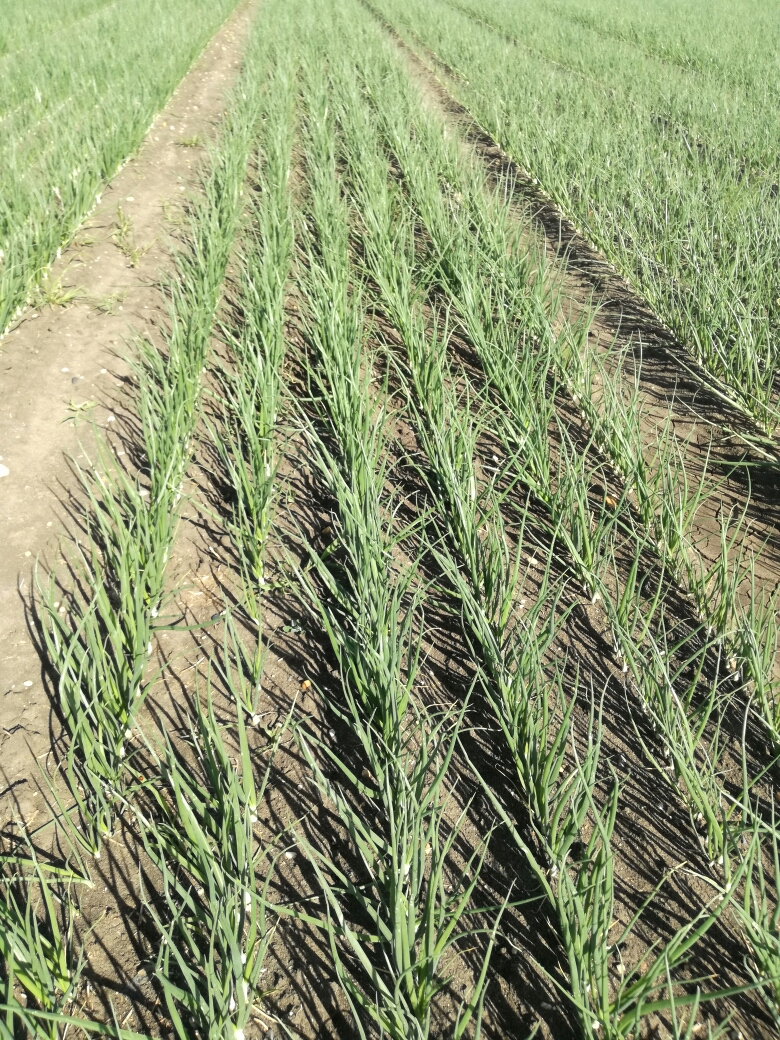 Kolejną rzeczą, która przykuła moją uwagę na tych plantacjach to kwestia doboru odpowiedniej odmiany do terminu siewu. Producenci uprawiający cebule ozimą wiedzą, że optymalny termin siewu to mniej więcej czas pomiędzy 10-25 sierpnia. Część producentów decyduje się na wcześniejszy termin siewu aby uzyskać większy plon wiosną jednak występuje wtedy ryzyko, że plantacja wybije w pędy kwiatostanowe. Takie ryzyko można ograniczyć wysiewając właściwą odmianę wczesną. Doskonale to widać na załączonym obrazku.