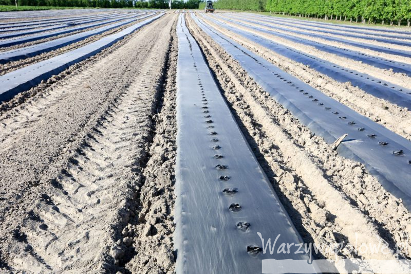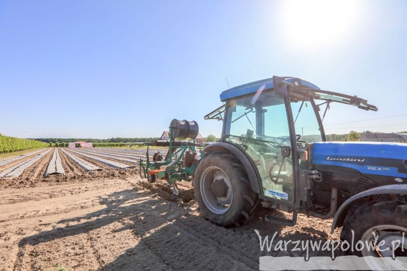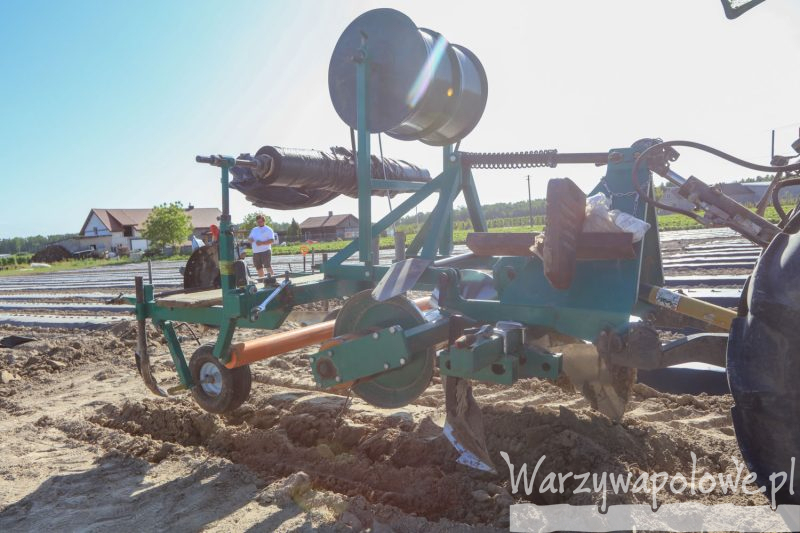 Do przygotowania zagonów pod uprawę ogórka wykorzystana jest maszyna firmy Kruszec. Podczas jednego przejazdu gleba zostaje spulchniona, uformowana w zagon. Równocześnie rozkładane są dwie linie kroplujące na pojedynczy zagon oraz folia. Na koniec brzegi zagonów zostają obsypane ziemią. Ta maszyna bardzo dobrze się sprawdza w naszym gospodarstwie. Zagony są sztywne, zbite. Dzięki temu nie mamy sytuacji rozmywania ziemi i rozluźniania się zagonu po nasączeniu wodą – wyjaśnia Mateusz Włodarczyk z gospodarstwa w Hornigach. Podczas przejazdu maszyny wykonywane są równocześnie otwory pod sadzenie roślin. Mają kształt bryłki korzeniowej rozsady co zdecydowanie ułatwia sadzenie roślin. Do wyściółkowania zagonów użyta została folia biodegradowalna z firmy Agrimpex.