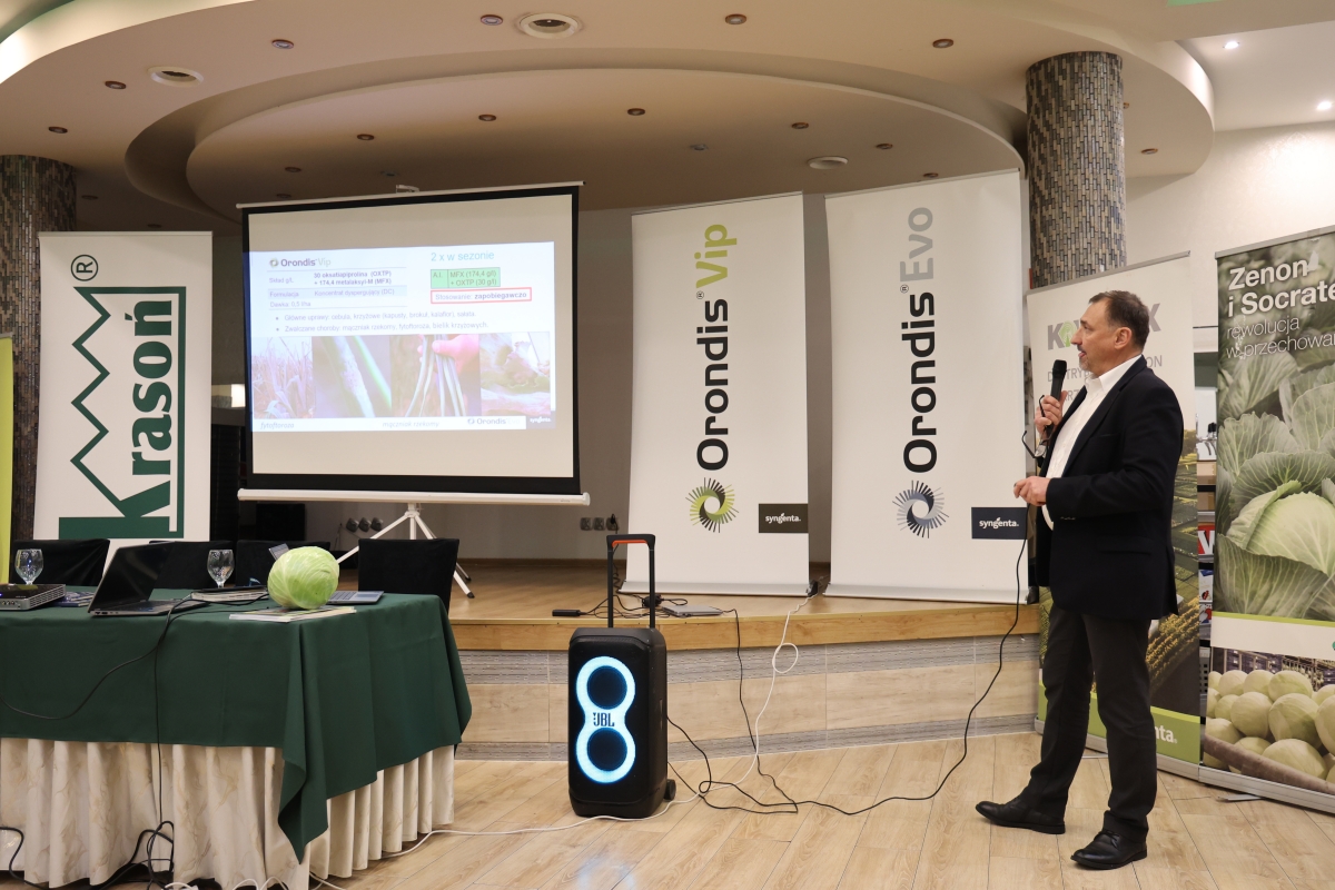 Podczas szkolenia odbywającego się 1 lutego w Charsznicy pt. Nowoczesna i precyzyjna produkcja kapusty kluczem do sukcesu, Roman Parzych z. firmy Syngenta szczegółowo omówił rozwiązania przeznaczone do ochrony warzyw. Jak podkreślał, z obecnego portfolio można „w praktycznie każdym gatunku zbudować albo cały program ochrony, albo zabezpieczyć dużą część sezonu, tak żeby uprawy dotrwały do końca wegetacji w dobrej kondycji”. W swojej prezentacji Roman Parzych skupił się zarówno na fungicydach, insektycydach, jak i coraz ważniejszych produktach biologicznych oraz biostymulatorach.