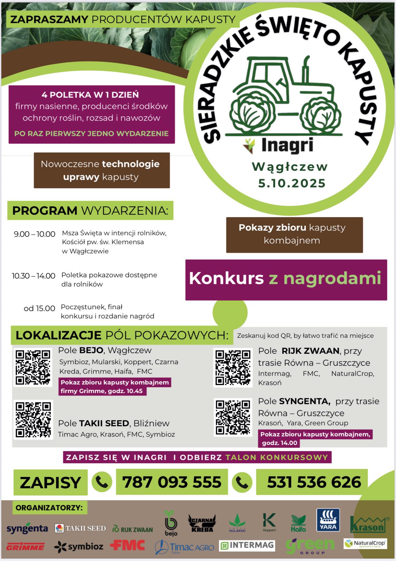 Cztery poletka pokazowe, a wraz z nimi stoiska firm nasiennych, producentów środków ochrony roślin, rozsad i nawozów czekają na producentów kapusty w niedzielę, 5 października w Wągłczewie k. Sieradza. Będzie można poznać najnowsze technologie uprawy kapusty oraz obejrzeć pokazy zbioru kombajnowego. Przed nami Sieradzkie Święto Kapusty!