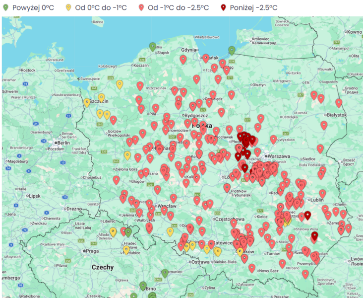 Umiarkowane przymrozki (-1°C do -2,5°C – różowe punkty) będą bardzo liczne: