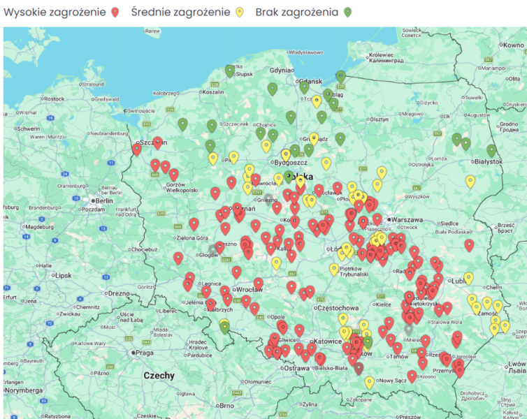 Średnie zagrożenie (żółte punkty) obserwowano: